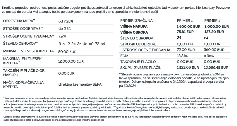 Komercialni pogoji veljajo na dan objave (11.8.2025) in se lahko spremenijo. Preverite najnovejše pogoje na spletnih straneh Leanpay)